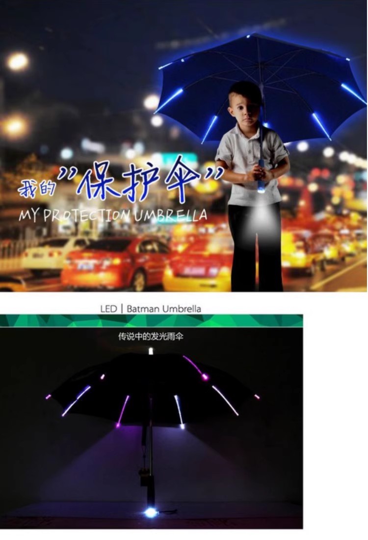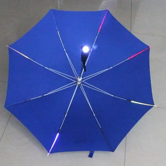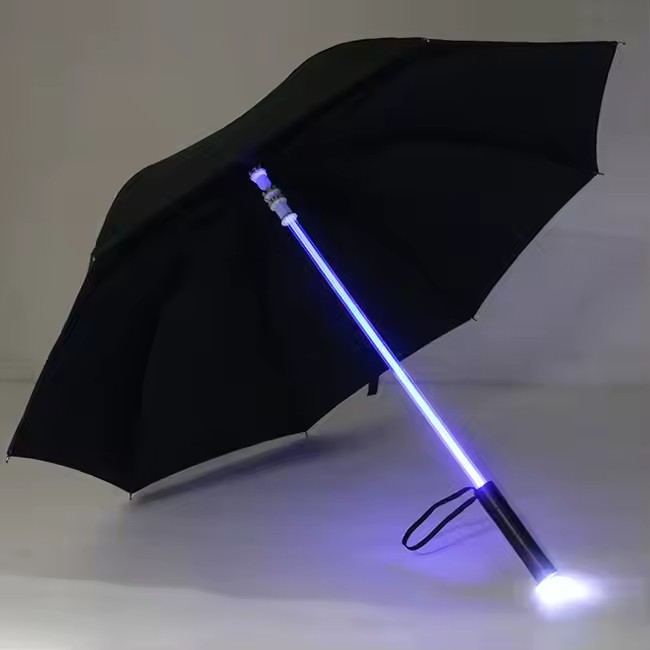 Край или каркас зонта украшен светодиодными полосками, которые можно заряжать через USB или питать от батарей, чтобы излучать монохромный или многоцветный свет (например, белый свет, градиент RGB). Некоторые продукты поддерживают регулировку яркости или режим мигания.